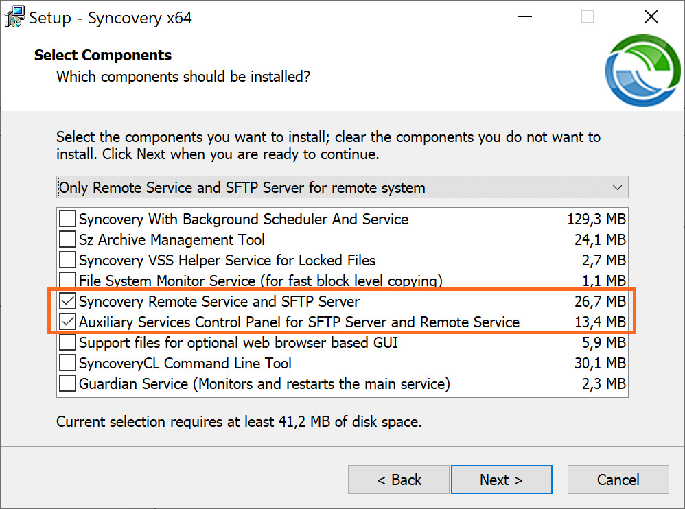 Скачайте последнюю версию Syncovery 11 со своей страницы загрузки. Запустите программу установки на ПК, который будет выполнять роль сервера. Обязательно выберите два пункта установки, показанные на скриншоте ниже: