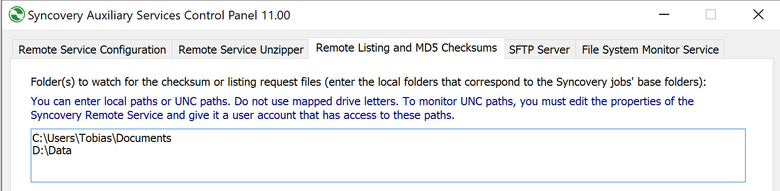 Далее мы настроим удалённую службу Syncovery, которая помогает быстро формировать списки папок. Просто укажите пути, с которыми нужно работать, на третьей вкладке, как показано ниже: