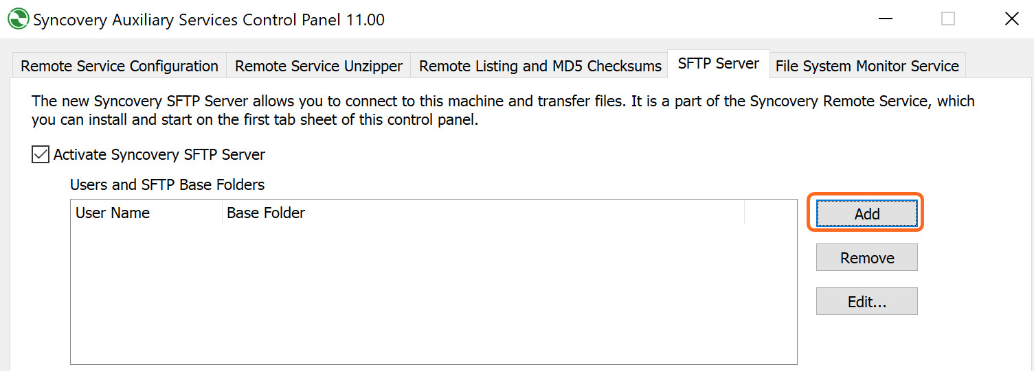 Теперь пора настроить функцию SFTP-сервера. Установите флажок Activate Syncovery SFTP Server и нажмите «Add», чтобы добавить пользователей: