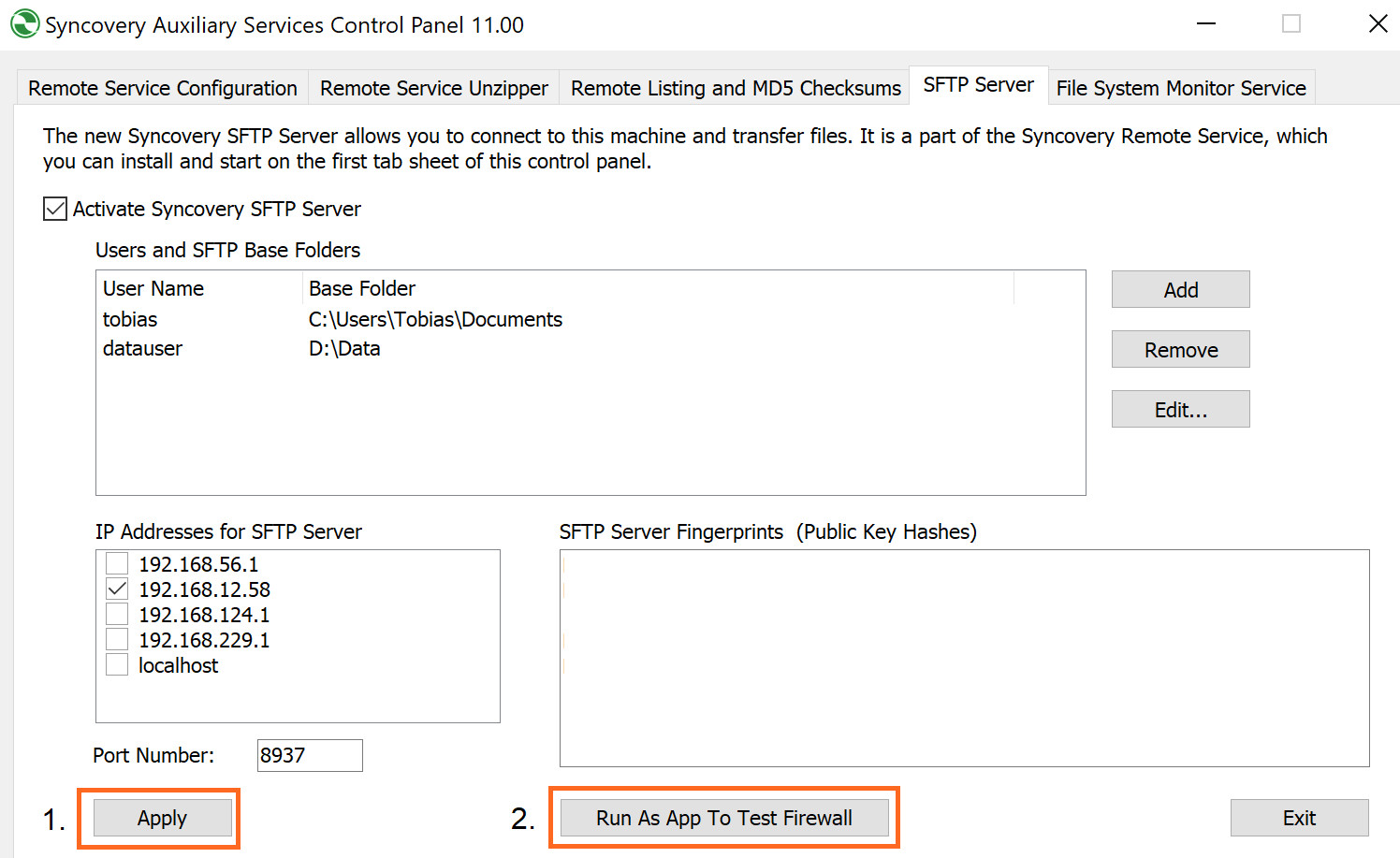 Вкладка сервера SFTP теперь будет выглядеть примерно так, как на следующем снимке экрана. Пожалуйста, выберите IP-адрес сетевого адаптера LAN, который соединяет ваш ПК с Интернетом. Обратите внимание на номер порта, который можно изменить. Стандартный порт SFTP на самом деле 22, но по соображениям безопасности мы не хотим использовать именно его. Нажмите кнопку Apply, а затем «Запустить как приложение для проверки брандмауэра». Эта кнопка выполнит пробный запуск сервера SFTP в окне командной строки, и, будем надеяться, вызовет запрос Windows Firewall, который позволит сделать сервер SFTP доступным извне.