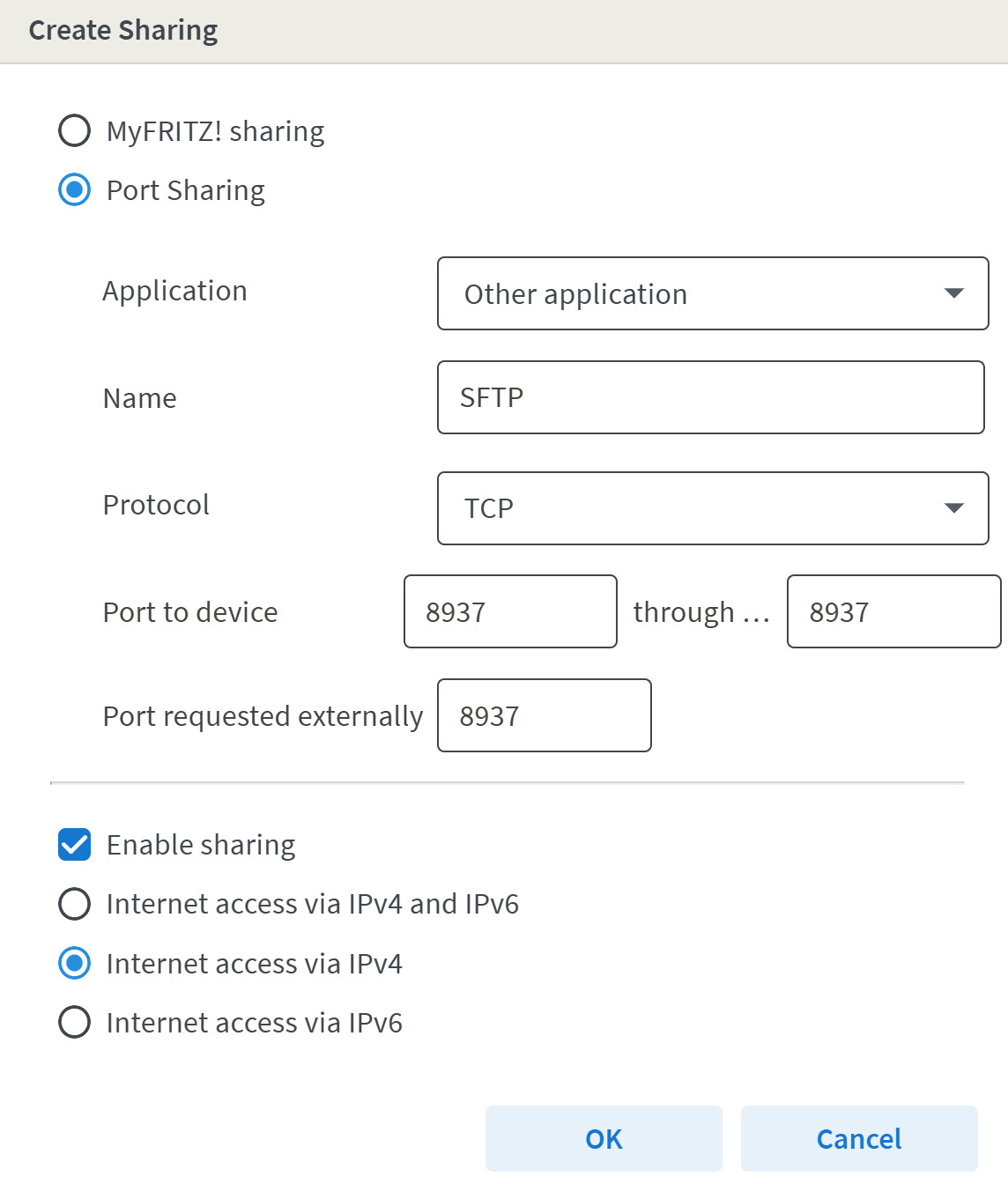 Чтобы входящие запросы от Syncovery на другом ПК могли достичь SFTP-сервера, необходимо настроить ваш интернет-роутер так, чтобы он перенаправлял попытки подключения на ПК, на котором запущен SFTP-сервер. Соответствующие страницы настроек в роутере могут называться «Интернет → Разрешить доступ», «Общий доступ к портам» или «Переадресация портов». Возможно, вам потребуется выбрать ПК из списка подключённых устройств или ввести его IP-адрес в локальной сети, а затем указать порт, который вы хотите использовать. Делайте это только в том случае, если вы указали достаточно сложный пароль для всех пользователей SFTP, как описано выше!
