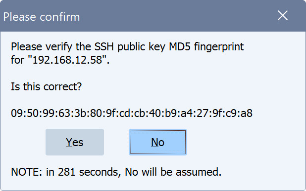 При первом подключении Syncovery покажет запрос с просьбой подтвердить отпечаток SFTP-сервера. Пожалуйста, проверьте его по отпечаткам, отображаемым сервером, чтобы убедиться, что ваше одноранговое соединение будет безопасным.