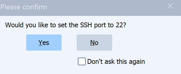 Когда вы нажмёте OK, Syncovery может спросить, хотите ли вы изменить порт на 22 (стандартный порт SFTP). Убедитесь, что вы не позволяете ему изменить порт! Мы действительно хотим избежать использования порта по умолчанию, поскольку он постоянно подвергается попыткам взлома.