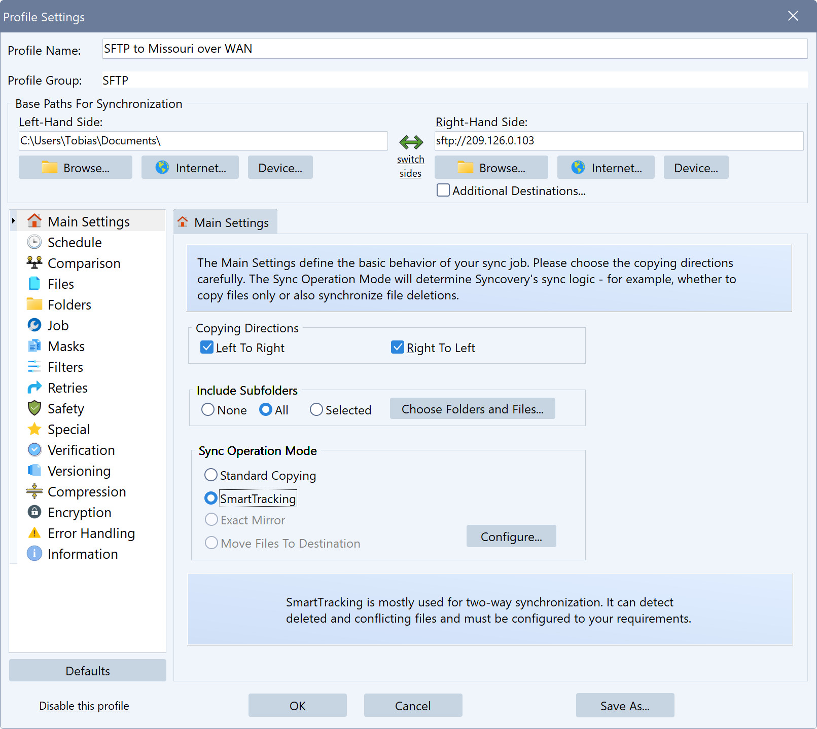 Основные настройки профиля Syncovery