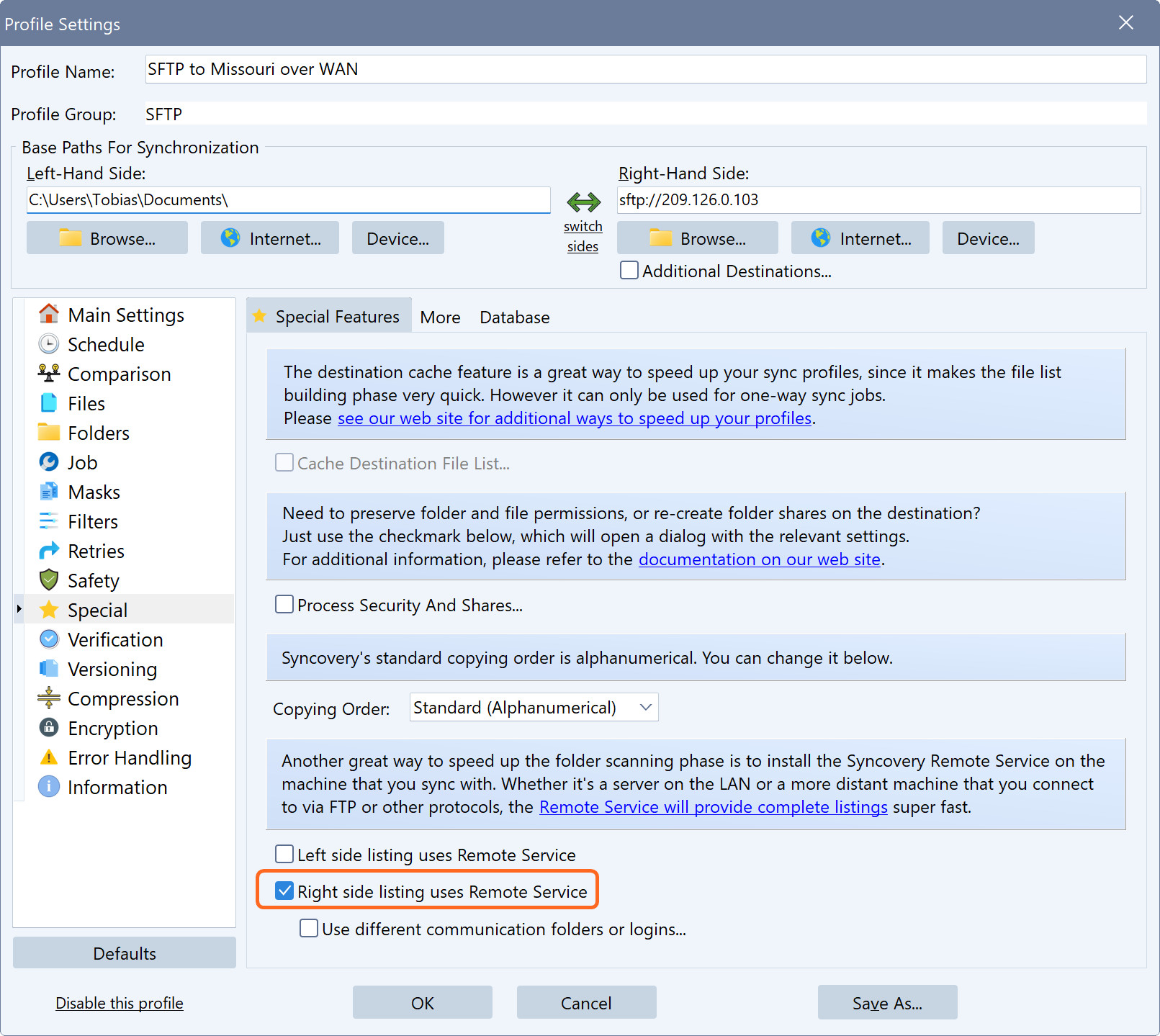 Наконец, чтобы значительно ускорить получение списка папок, укажите, что для получения списка следует использовать Remote Service. Это работает только если базовый путь профиля указан в разделе Remote Listing на другом ПК, что мы и сделали как один из первых шагов в начале этого руководства.